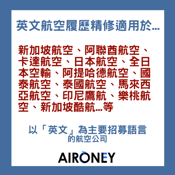 <div class=”public-DraftStyleDefault-block public-DraftStyleDefault-ltr”>AirCV英文航空履歷優化服務適用於報考<strong>派遣基地遍部全球</strong>,<strong>以「<span style=”color: #26c9ff;”>英文</span>」</strong>為主要招募語言的航空公司。包括(但不限於):</div>
